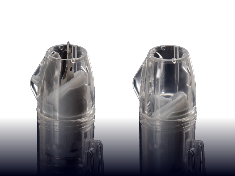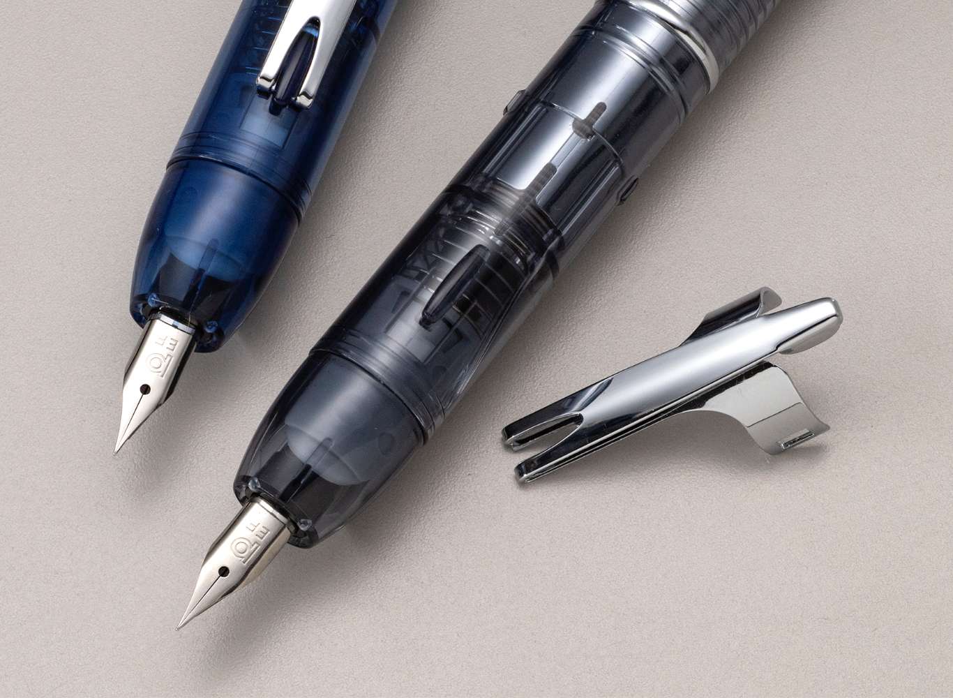 ボディに透明樹脂を用いて、ノック式万年筆ならではの複雑なメカニズムをデザインの魅力に取り入れています。